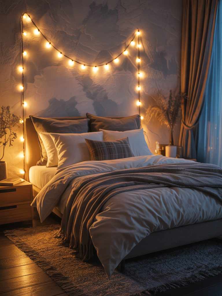 Creating a warm, inviting bedroom doesn’t have to be complicated. One of the simplest ways to instantly add comfort and charm is by incorporating string or fairy lights. Soft, warm lights draped across the headboard, around windows, or along a wall can transform even the simplest bedroom into a cozy retreat. Layering the lights with textured bedding, plush pillows, and a soft throw enhances the feeling of warmth and relaxation.