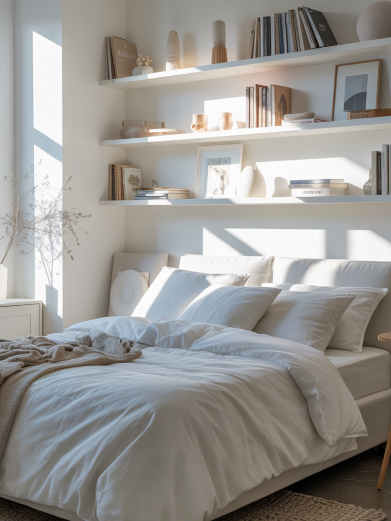 White floating shelves are ideal for creating a light and open bedroom, especially in smaller spaces. They reflect light, reduce visual heaviness, and make the room feel bigger than it actually is.