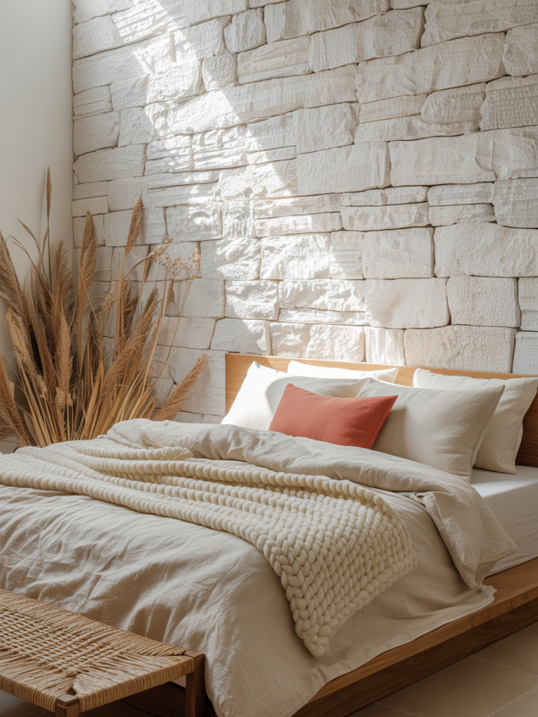 One of the easiest ways to elevate a minimalist bedroom is by introducing subtle architectural texture. A white stone accent wall adds quiet visual interest while keeping the palette clean and airy. Unlike painted walls, stone surfaces catch light differently throughout the day, creating soft shadows that add depth without overwhelming the space.