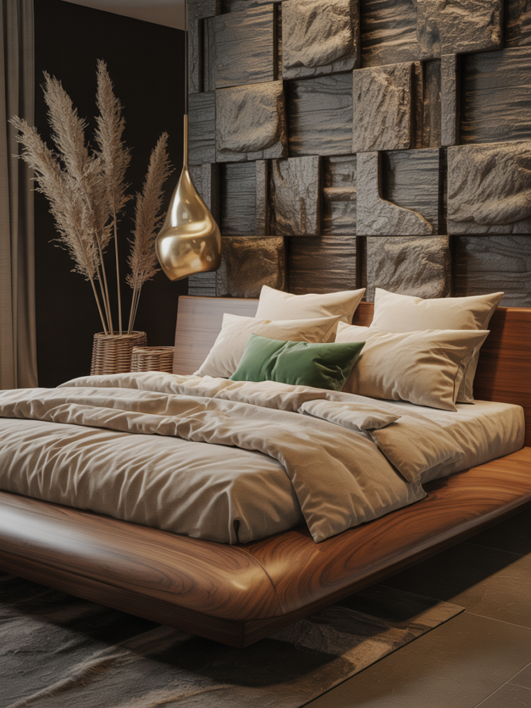 Walls also play a major role in defining the atmosphere of the room. A natural stone feature wall adds architectural interest and texture, turning a simple bedroom into a more luxurious retreat. Paired with modern wall sconces that cast a warm ambient glow, the room instantly feels cozy and layered.