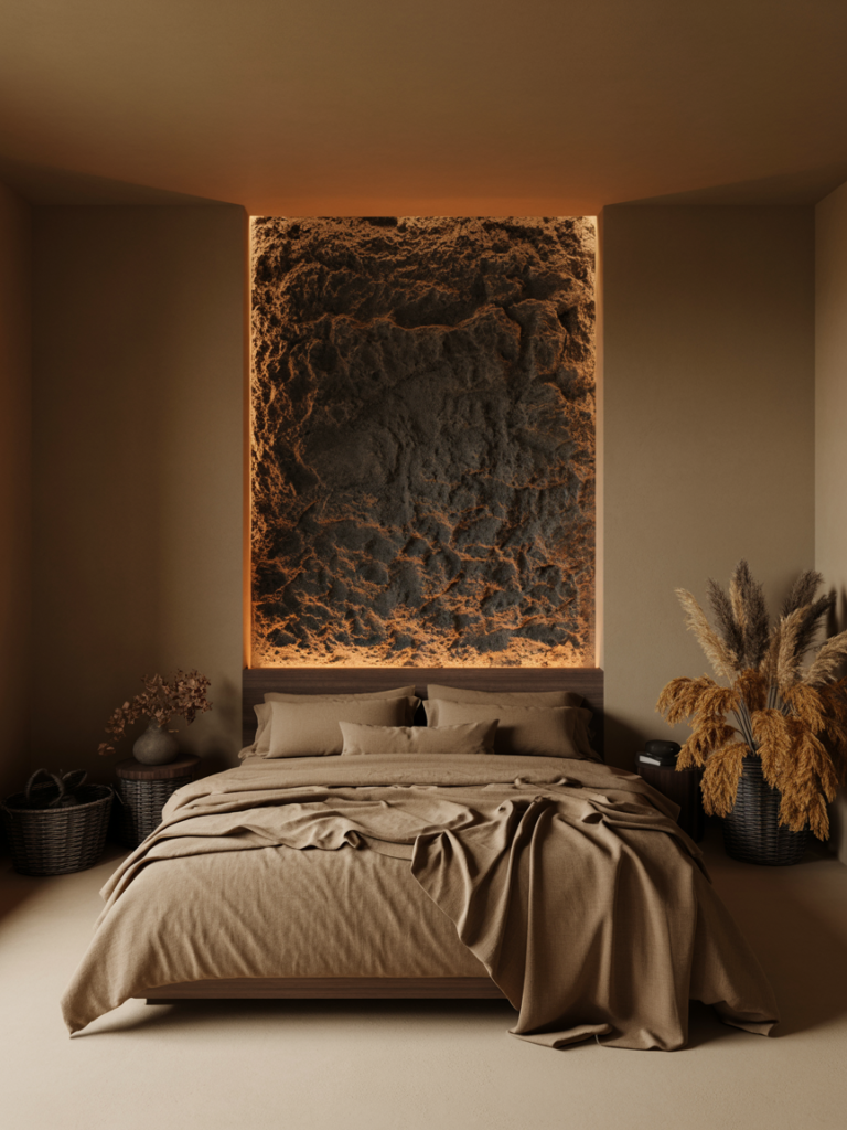 Minimalist bedrooms don’t have to feel cold or empty. By introducing earthy tones and layered materials, you can create a space that feels both refined and inviting. The combination of natural stone, warm lighting, and terracotta accents brings depth to a clean, uncluttered design.